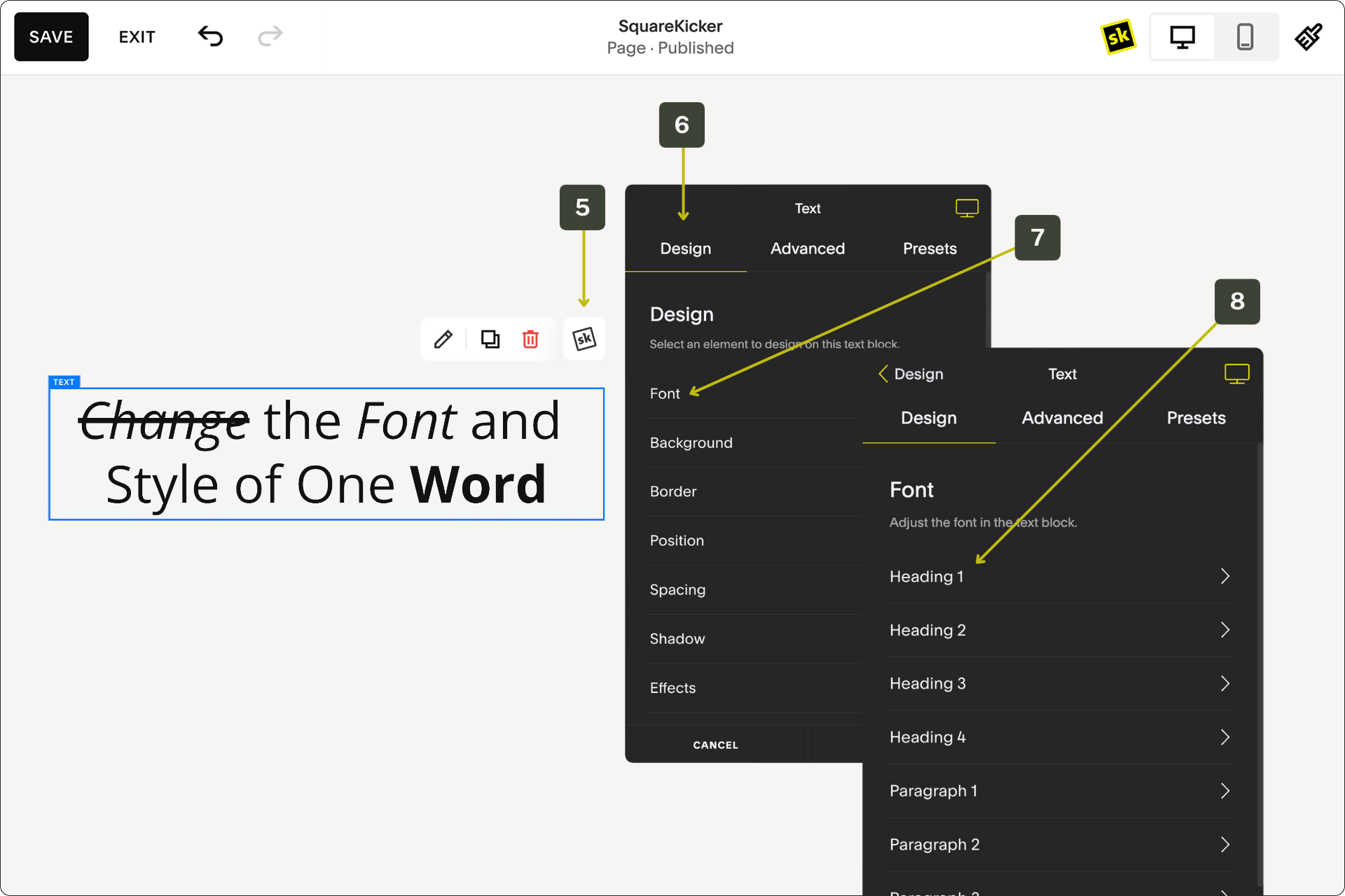 STRIKEstyling (This creates a trigger for the changes and the styling can be removed later in the SquareKicker design panel). - Select the Squarespace text block and click on the SquareKicker icon.